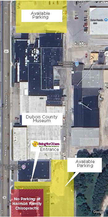 Event parking will be available behind the Dubois County Museum, or to the North of the building in front of Ruler Foods. Please do not park at Harmon Chiropractic: