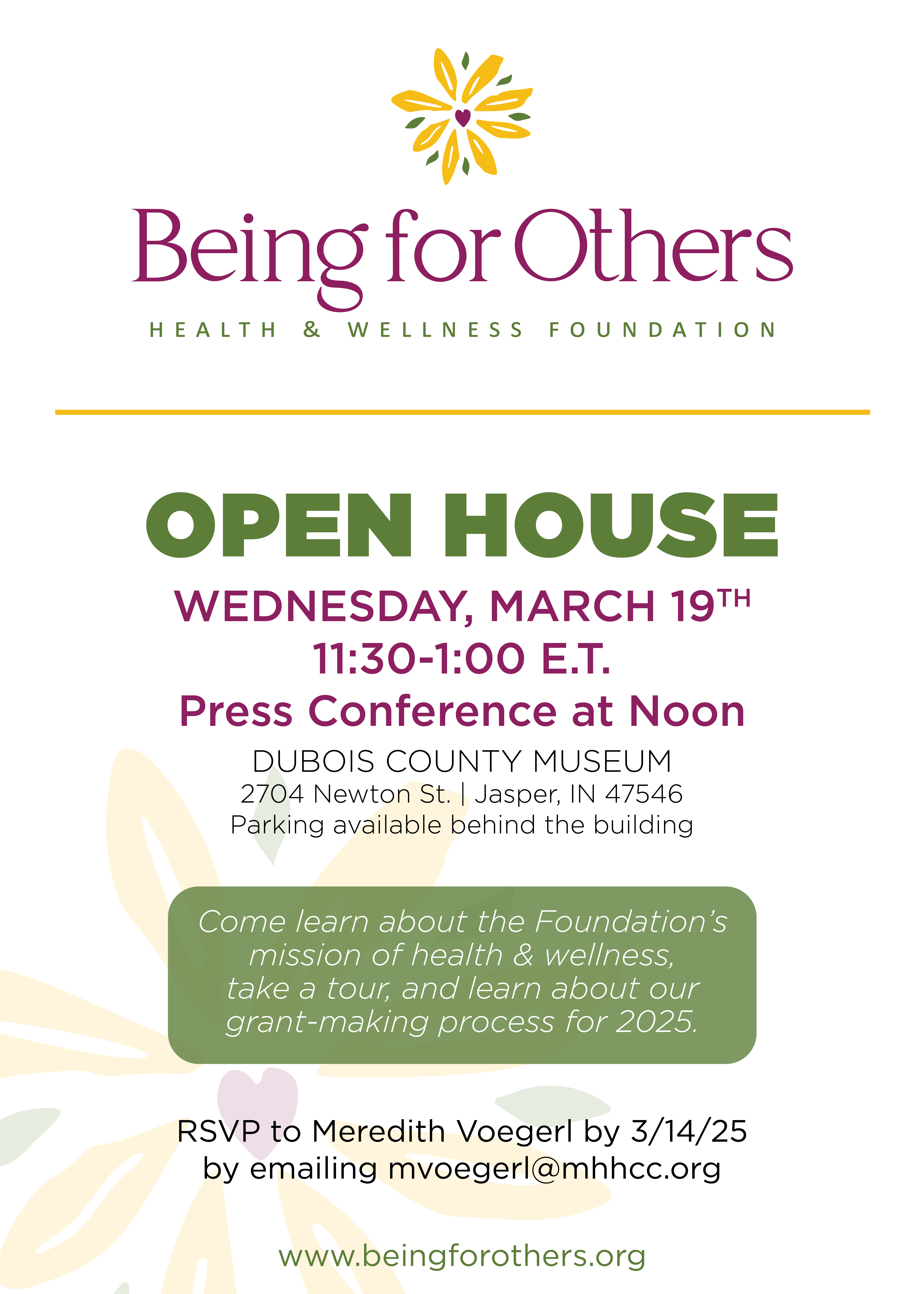 You are cordially invited to an open house gathering of the newly established Being for Others Health and Wellness Foundation on March 19th at the Dubois County Museum! Please see the invitation below.